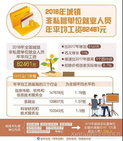 在2018年城鎮非私營單位職工年平均工資數據顯示,信息傳輸、軟件和信息技術服務業持續快速發展,平均工資為147678元,為全國平均水平的1.79倍,平均工資水平首次超過金融業排名,在各行業門類中居首位。