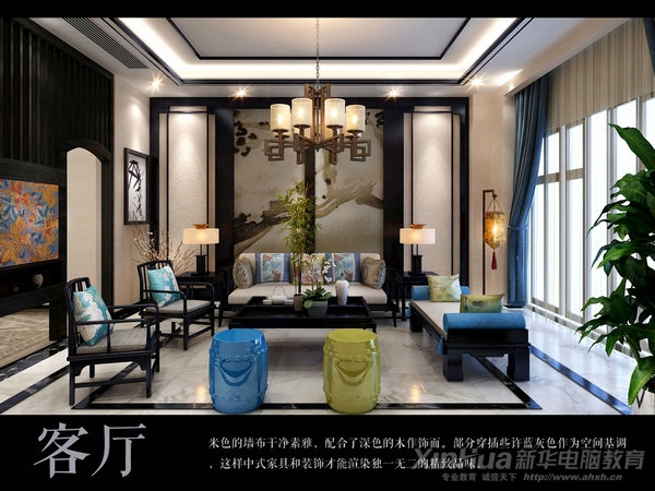 作品點評:米色的墻布干凈素雅,配合了深色的木作飾面。部分穿插些許藍灰色作為空間基調,這樣中式家具和裝飾才能渲染獨一無二的精致品味。