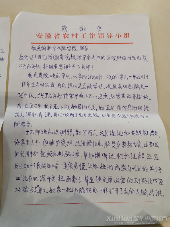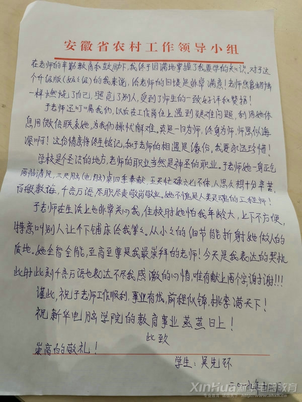2019年12月3日,安徽新華電腦專修學院的于飛老師收到了一封特殊的信。整封信字跡工整、筆筆動情,是于飛老師的學生吳先環所寫。