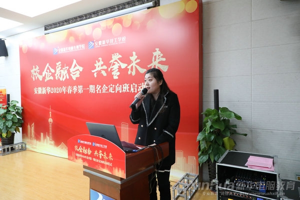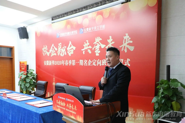 上午10時許,安徽新華電腦專修學院院領導致歡迎詞,他在致辭中說到:今年,國家發改委、教育部辦公廳等七部門都發布了有關產教融合、校企聯盟的人才培養意見。意見中明確指出,要推動校企深度合作,要優先支持建設產教融合創新項目、職業教育校企深度合作項目。在此大背景下,安徽新華《名企定向班》的創新教學模式,使得學生與企業之間能夠無縫銜接,實現共贏。