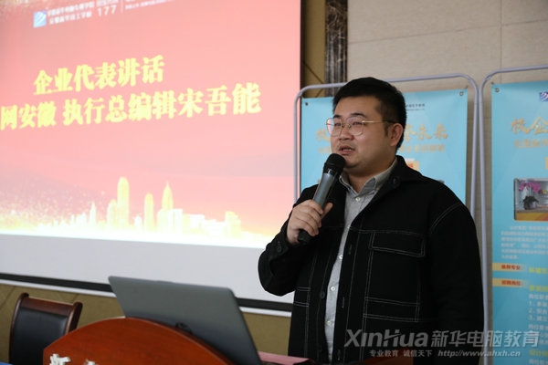 本次啟動(dòng)儀式除了智慧雙語幼師專業(yè)的發(fā)布外,還有2020春季第二期企業(yè)掛牌班的簽約儀式。作為安徽新華電腦專修學(xué)院的長(zhǎng)期合作企業(yè),鳳凰網(wǎng)安徽?qǐng)?zhí)行總編輯宋吾能代表參會(huì)企業(yè)上臺(tái)講話,他在講話中說:政府已指出,要“依靠行業(yè)企業(yè)發(fā)展職業(yè)教育,推動(dòng)職業(yè)院校與企業(yè)的密切結(jié)合”,要“大力推行工學(xué)結(jié)合、校企合作的培養(yǎng)模式”。可見,校企合作是一種重視培養(yǎng)質(zhì)量,注重在校生學(xué)習(xí)與企業(yè)實(shí)踐,注重學(xué)校與企業(yè)資源、信息共享的“雙贏”模式。