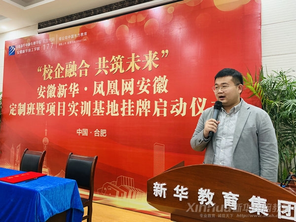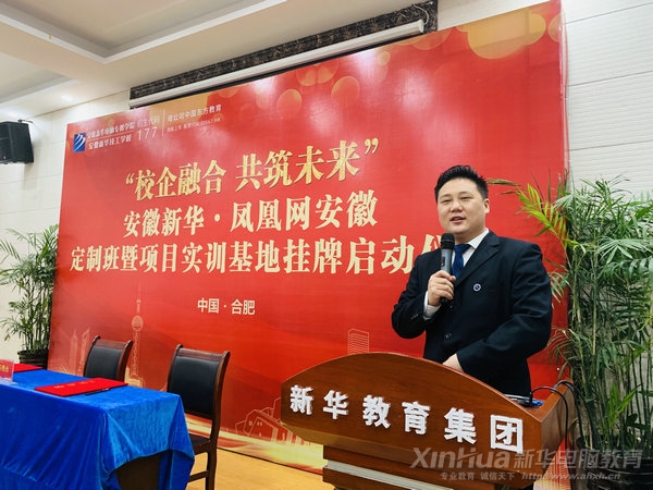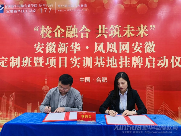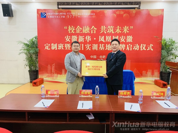 2020年5月9日,“校企融合 共筑未來”安徽新華·鳳凰網安徽定制班暨項目實訓基地掛牌啟動儀式在安徽新華電腦專修學院學術報告廳舉行。鳳凰網安徽執行總編輯宋吾能來校與我院簽訂合作協議并授予我院鳳凰網安徽項目實訓基地牌匾。