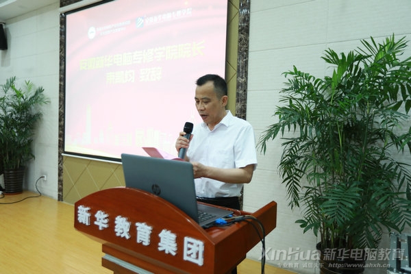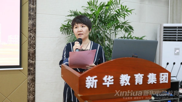 兩位領導的精彩致辭,讓我們明白了本次“直播學院”成立的重大意義,緊接著安徽新華電腦專修學院教務處、新華直播學院院長主任朱葉偉上臺詳細解讀了直播學院的教學模式。