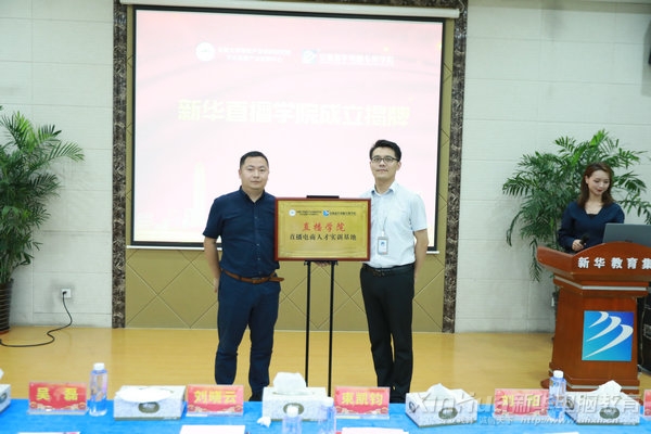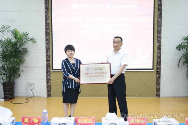 各位領導發言完畢后,安徽新華電腦專修學院副院長顏陳陳、安徽大學綠色產業創新研究院文化創意產業發展中心副主任王曉亮為新華直播學院成立揭牌!