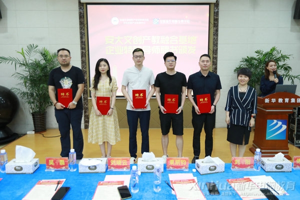 接下來劉院長為搜狐網視頻高級總監吳磊、搜狐視頻會員中心高級經理劉陽、阿里巴巴直播服務商杭州天字網絡科技有限公司合伙人汪士鈞、字節跳動達人服務商 杭州新燭傳媒有限公司總裁傅魯華頒發安大文創產教融合基地企業特聘導師聘書。