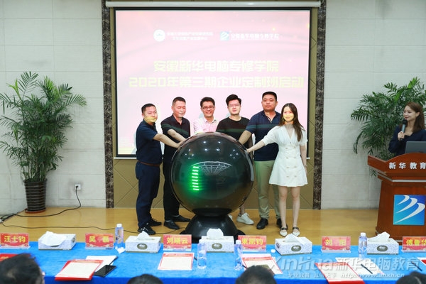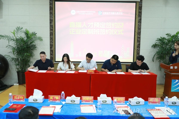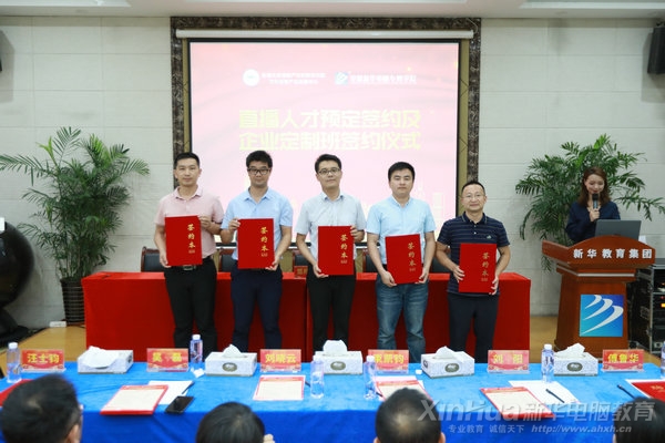 最后,各位企業領導依次上臺,安徽新華電腦專修學院副院長顏陳陳與杭州新燭傳媒公司、華南城直播電商園區、安徽恒燦通信技術服務有限公司、微笑互聯合伙人兼首席技術官、安徽福的信息技術服務有限公司、安徽飛夢信息科技有限公司、安徽眾禹科技有限公司、安徽慕朗科技有限公司等企業代表一同簽訂人才預定協議,共同啟動安徽新華電腦專修學院2020年第三期企業定制班!