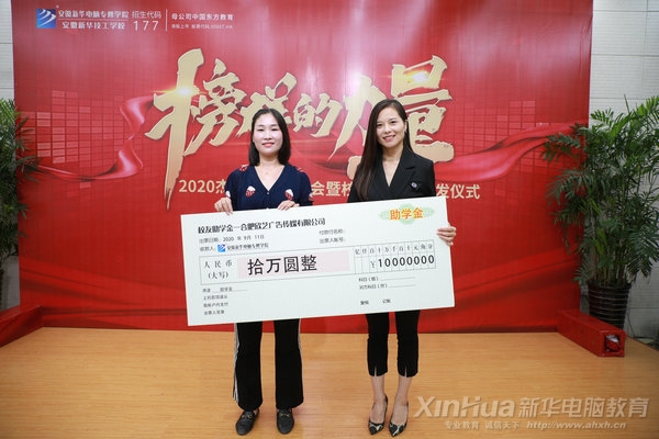 最后,程欣學姐向母校——安徽新華電腦專修學院捐贈10萬元助學基金,用以幫助家庭條件貧困的優秀學子。