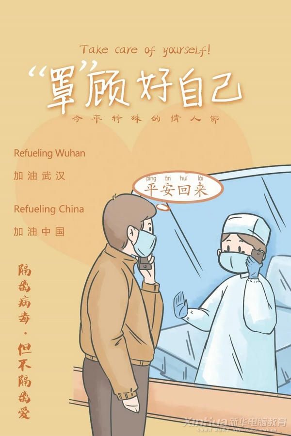 抗疫期間剛好是情人節(jié),因此以這樣的場景來創(chuàng)作。該作品講述白衣天使沖在戰(zhàn)“疫”前線上,想念家人,隔著窗戶和家人打電話的情景,寓意著“隔離病毒,但不隔離愛”。