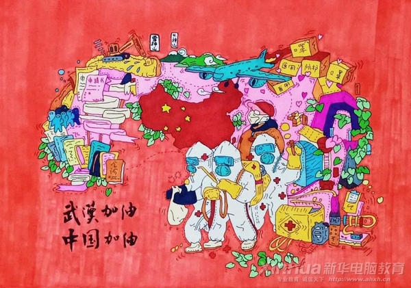 題材選取的中心思想為:所有人齊心協(xié)力萬眾一心,與病疫戰(zhàn)斗到底。畫面選擇中國地圖為中心點(diǎn),用國旗的顏色和五角星代表國人在遇到困難時(shí)的團(tuán)結(jié)一心。人物選擇上,有一線防護(hù)人員和群眾,他們帶著口罩消毒、拿物資、記錄、巡查。并通過醫(yī)藥包、飛機(jī)、挖掘機(jī)、醫(yī)用物品等具有代表性的東西對畫面進(jìn)行裝飾和串聯(lián),從而烘托出全國人民乃至全世界都在為“武漢加油!中國加油!”