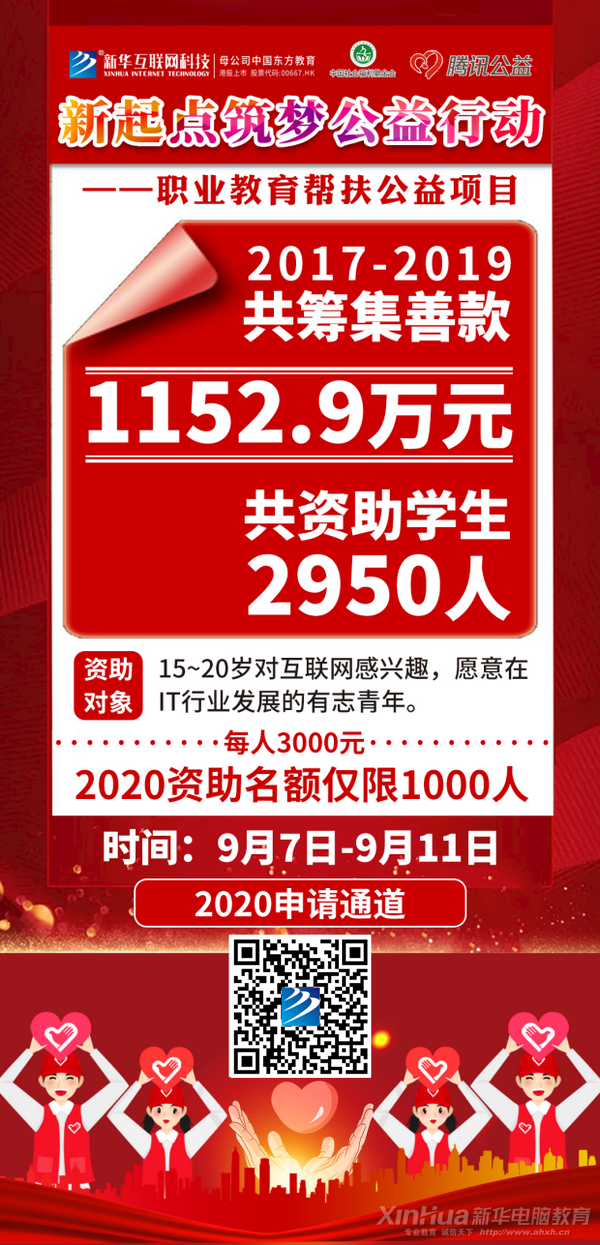 新華近年來推出拾柴計(jì)劃,筑夢(mèng)公益行動(dòng),志在5年內(nèi)幫助10000名貧困學(xué)生。每年的9月9日,全國(guó)30所電腦教育院校會(huì)同步啟動(dòng)99公益活動(dòng),通過“獎(jiǎng)助勤勉”和“扶貧扶智”等舉措,集“關(guān)愛、鍛煉、激勵(lì)、教育”為一體,大力開展精準(zhǔn)扶貧、教育扶貧,對(duì)貧困青年進(jìn)行技能培訓(xùn),并提供就業(yè)機(jī)會(huì),并讓更多人憑借自己的學(xué)習(xí)和努力,實(shí)現(xiàn)人生夢(mèng)想。