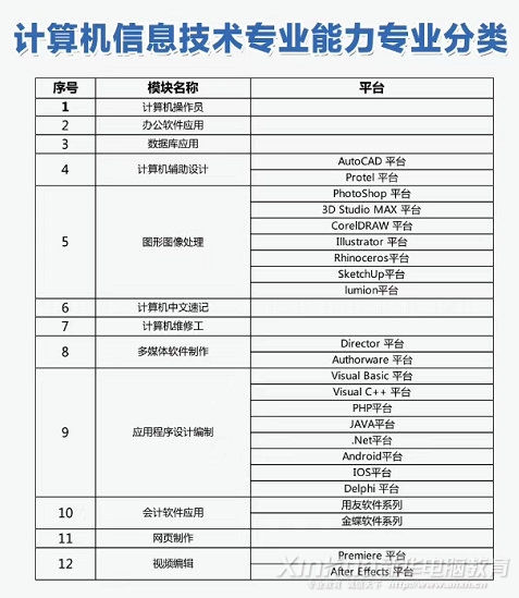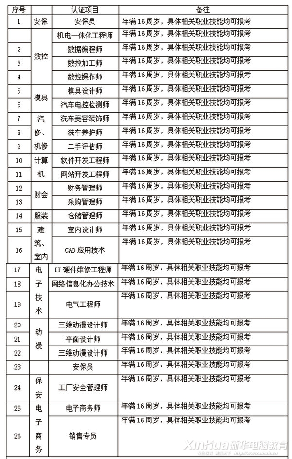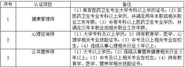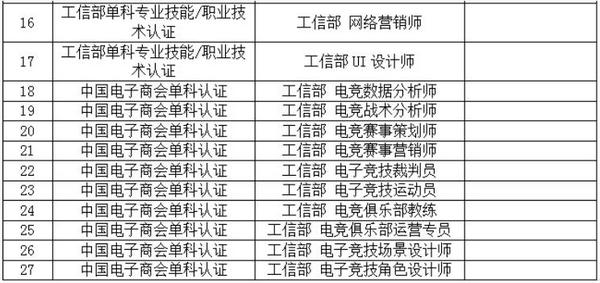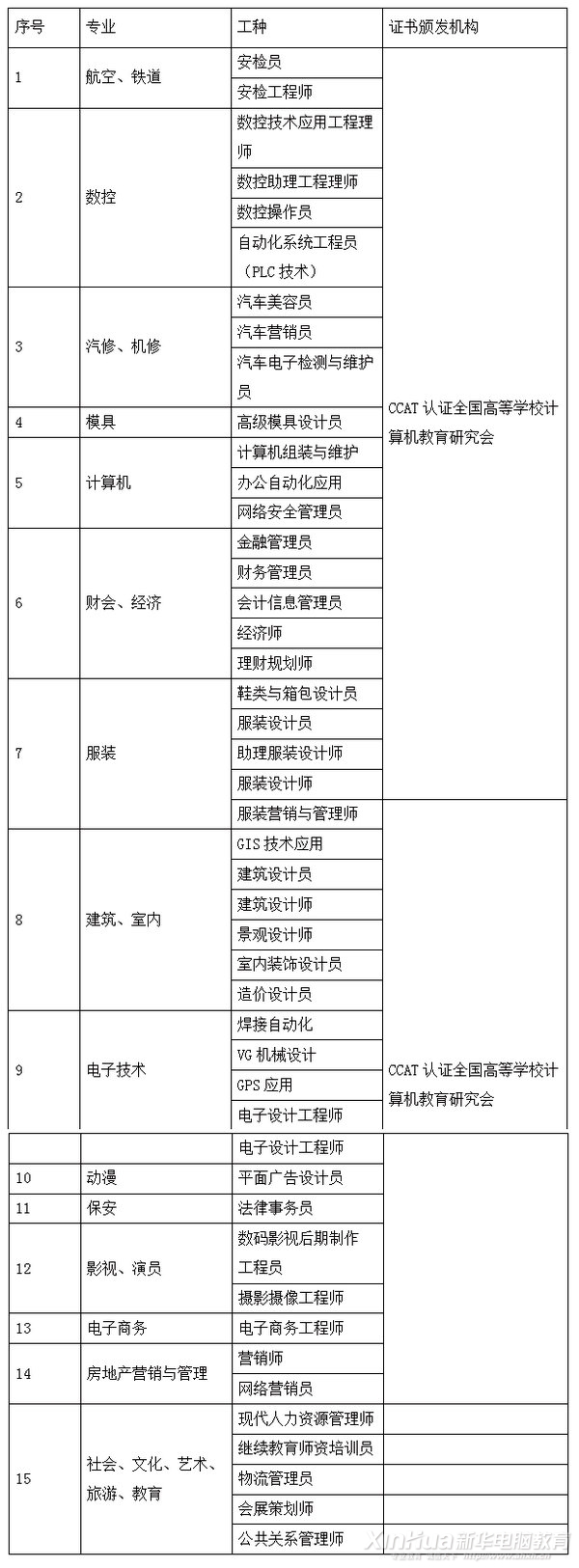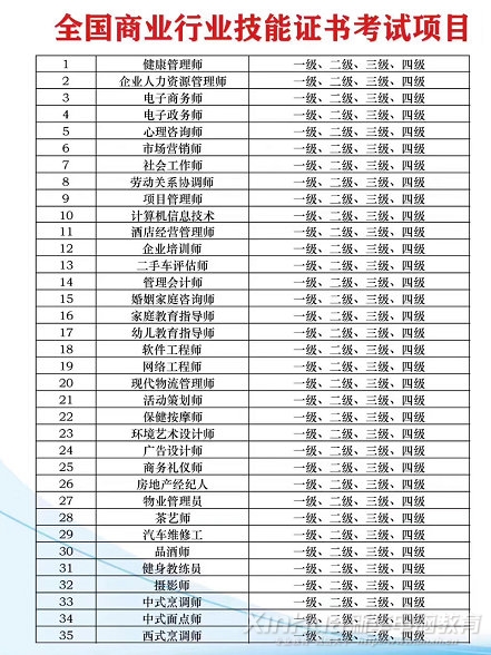 健康管理師、企業(yè)人力資源管理師、心理咨詢師、二手車評估師、計算機方面、電子商務(wù)、影視動畫等35個熱門專業(yè)(每個證書都有四級、三級、二級、一級)。