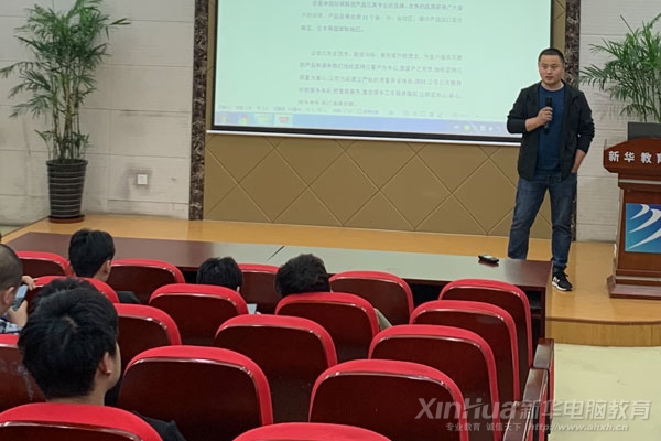 同時,安徽新華電腦專修學院多功能報告廳又是另一番景象。安徽申創環保科技有限公司正對電商學子解說他們的公司的優越之處。當前,他們急需電商專業人才,涉及線上運營、美工、店面設計等多個方向,對于我校學子而言也是一次難得的機遇。