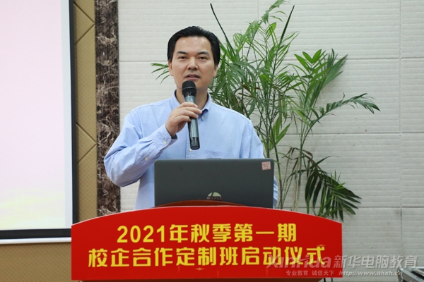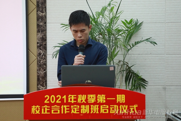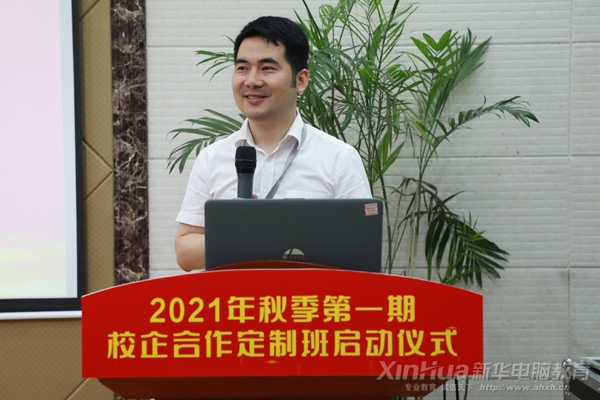 安徽新華電腦專修學院院長助理致歡迎詞,王助首先向在場的定制班的同學們表示熱烈的祝賀并歡迎蒞臨我校的各家企業。并指出學院與6大實力企業的強強合作,旨在促進“以教促產、以產強教、產教并舉、多元共贏”良好局面的形成;構建校企共建課程體系、校企共育人才、校企共建實訓基地,同時將定制班的人才培養目標落到實處,將學生培養成為具備行業崗位高素養的優秀互聯網人。