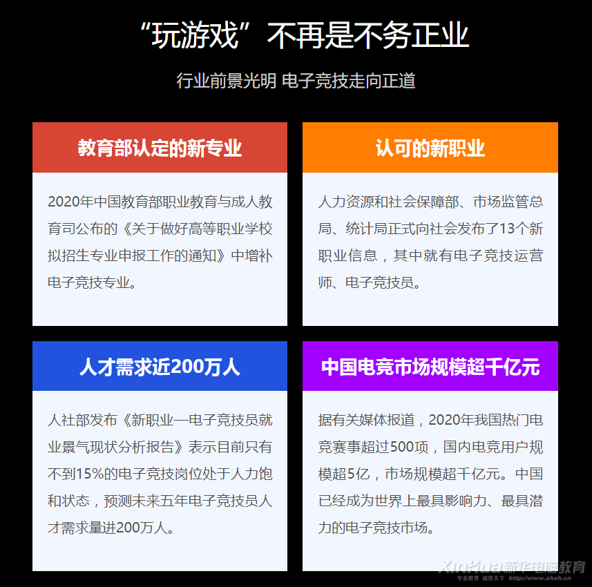 根據(jù),2019年艾瑞數(shù)據(jù)發(fā)布的《中國(guó)電子競(jìng)技行業(yè)研究報(bào)告》顯示,2019年,電競(jìng)市場(chǎng)規(guī)模達(dá)1130.5億元 較2018年增長(zhǎng)20.2%,預(yù)計(jì)2020年將達(dá)1353.1億元。另據(jù)人社部2019年6月發(fā)布的《新職業(yè)——電子競(jìng)技員就業(yè)景氣現(xiàn)狀分析報(bào)告》顯示,預(yù)測(cè)未來五年電子競(jìng)技員人才需求量近200萬人,現(xiàn)階段我國(guó)電競(jìng)職業(yè)選手僅有10萬人左右,86%電子競(jìng)技員從業(yè)者的薪資是當(dāng)?shù)仄骄べY1-3倍,由此可見,電子競(jìng)技專業(yè)人才十分稀缺!