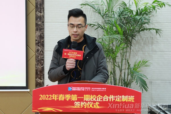 安徽新華電腦專修學院院長助理王俊致歡迎詞,王助首先對各位嘉賓、同學表示熱烈歡迎與衷心感謝。并表示,本次與五大企業(yè)合作,簽訂校企定制班是職業(yè)教育主動適應(yīng)經(jīng)濟發(fā)展新形勢和技能人才成長成才新需求的趨勢,“校企合作定制班”的創(chuàng)新教學模式,打破了傳統(tǒng),按企業(yè)標準定向培養(yǎng),我校也將不斷創(chuàng)新完善數(shù)字經(jīng)濟人才發(fā)現(xiàn)和評價機制、產(chǎn)學研合作培養(yǎng)人才政策、人才創(chuàng)業(yè)扶持政策。