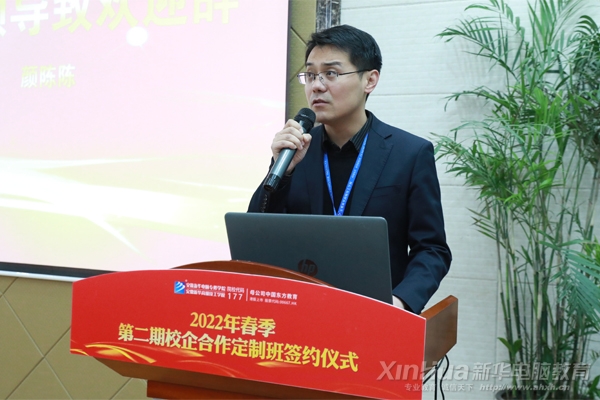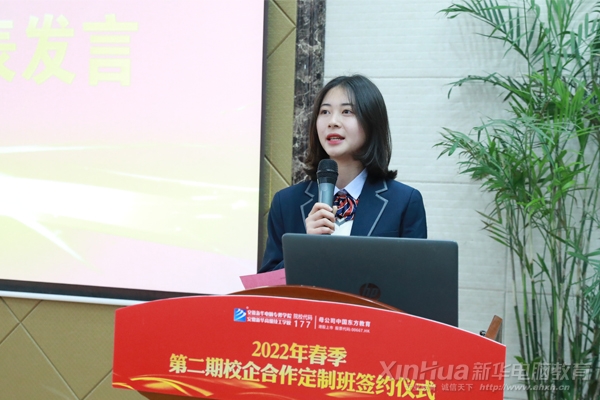 安徽新華電腦專修學院副院長顏陳陳為此次校企定制班簽約儀式致辭。顏院長首先向在場的定制班的同學們表示熱烈的祝賀并歡迎蒞臨我校的各家企業。并指出學院與各大名企的強強合作,旨在促進“以教促產、以產強教、產教并舉、多元共贏”良好局面的形成;構建校企共建課程體系、校企共育人才、校企共建實訓基地,同時將定制班的人才培養目標落到實處,將學生培養成為具備行業崗位高素養的優秀互聯網人。