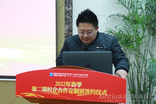 隨后,合肥市原色動畫有限責任公司總經理張王飛發表講話,他表示新華·云南創藝裝飾校企定制班,將是一次與安徽新華深度合作的最佳見證,并表示將為定制班學子提供切實可行的項目拓展實踐,助力學子成為互聯網優秀人才。