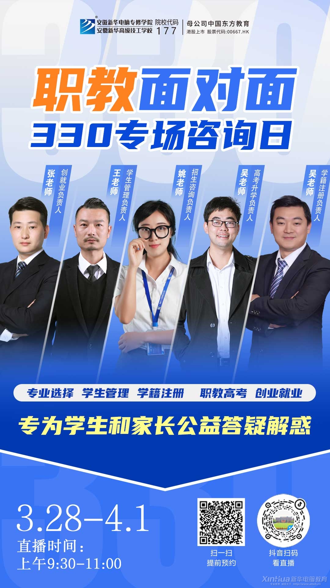【群英薈萃 “六說”紛紜】330咨詢日將于3月29日起連續開展3天,特設“六說講臺”直播間,分別為行業專家說、專業導師說、就業單位說、教學成果說、媒體見證說、新華學子說等六大模塊內容,層層突破,為在線網友提供實時咨詢答疑。記得提前關注“安徽新華電腦專修學院”官方抖音、快手賬號哦~我們直播間不見不散!