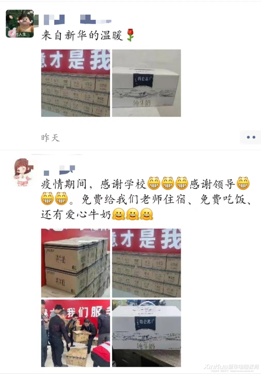 自學(xué)校啟動(dòng)緊急疫情防控以來,安徽新華全體教職工開啟居校辦公和居家辦公兩種狀態(tài),避免“兩點(diǎn)一線”等產(chǎn)生的不可控因素。這幾天,新華人的朋友圈是這樣的——“你可以永遠(yuǎn)相信新華,我愛新華!”“誰說天下沒有免費(fèi)的午餐?新華就有!”“什么?住校還發(fā)牛奶?小朋友還有旺仔!”“安徽新華就是別人家的學(xué)校,今晚收獲一大波來自學(xué)校發(fā)放的零食!”