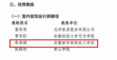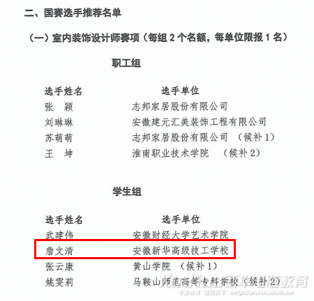 本次大賽由安徽省人力與社會資源保障廳、省總工會、省輕工業(yè)協(xié)會共同主辦下在合肥舉辦。來自企業(yè)、高校等多個設(shè)計行業(yè)的參賽選手同臺競技。經(jīng)層層評審,環(huán)藝專業(yè)詹文清同學(xué)榮獲室內(nèi)設(shè)計師賽項全省第二名,胡皓冉、熊新莉、朱恒、蔡蒙蒙同學(xué)榮獲優(yōu)秀獎,李寧寧、陳瑋琦、劉嘉樂、王晨璐、徐敏、周光磊、丁含鈺同學(xué)榮獲優(yōu)勝獎。指導(dǎo)老師蔡善媛被評為“優(yōu)秀教練”,安徽新華高級技工學(xué)校被評為“優(yōu)秀組織單位”!