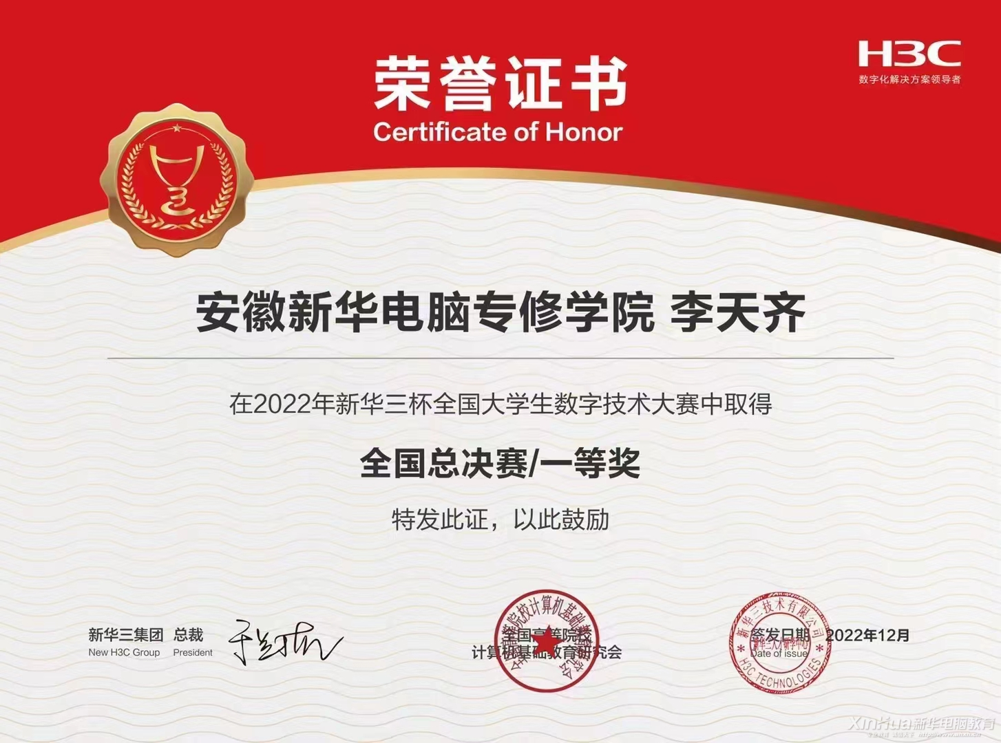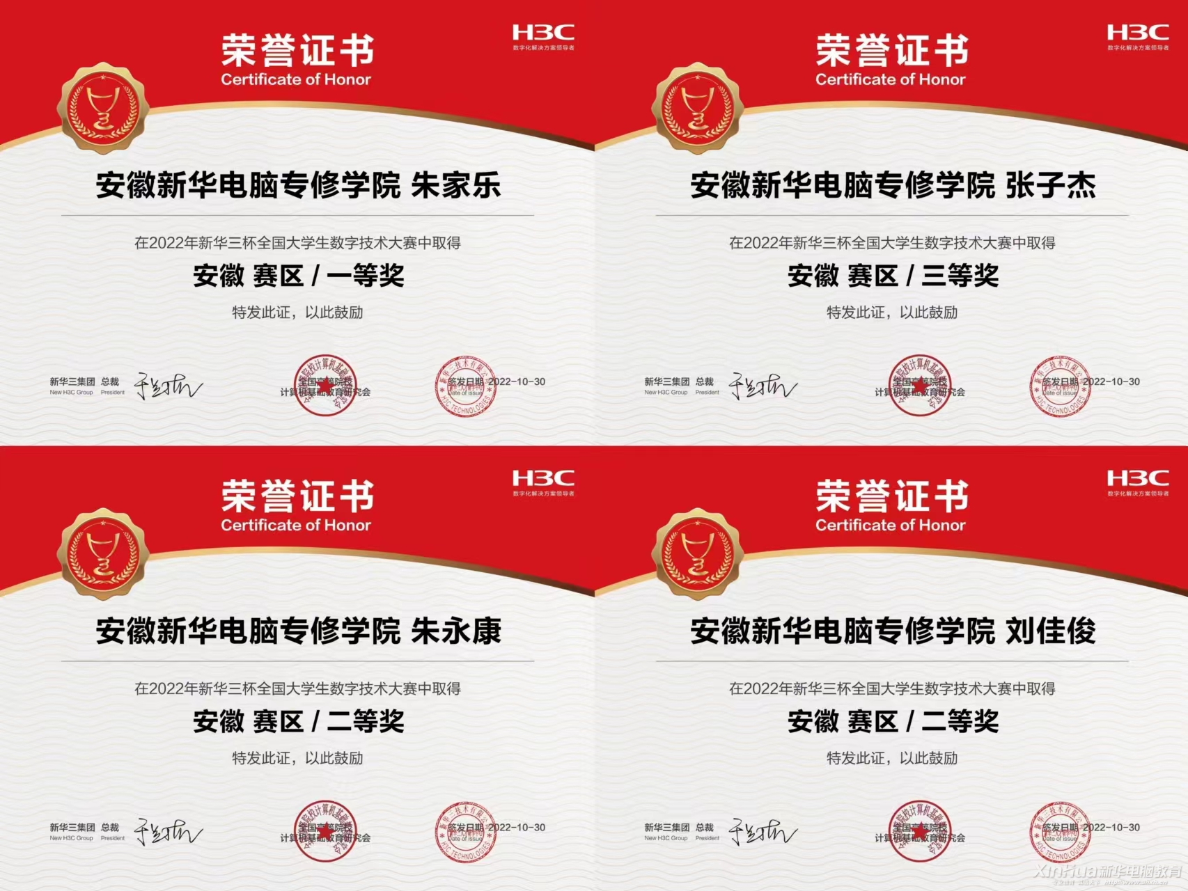 2022年第12屆新華三杯全國大學(xué)生數(shù)字技術(shù)大賽(簡稱:H3C杯)全國總決賽頒獎典禮圓滿落幕,安徽新華中網(wǎng)1902班的李天齊同學(xué)斬獲全國高職組一等獎!另,物聯(lián)網(wǎng)2102洪喆、朱家樂同學(xué)榮獲安徽省一等獎;物聯(lián)網(wǎng)2102朱永康、 網(wǎng)技2102劉佳俊、計算機應(yīng)用與維修2101尹子涵同學(xué)榮獲安徽省二等獎;網(wǎng)技2102張子杰、計算機應(yīng)用與維修2101宣揚杰榮獲安徽省三等獎。至此,