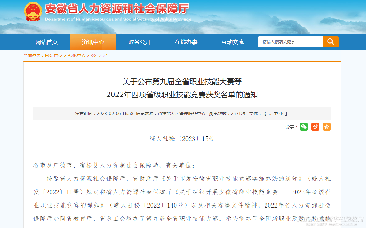 2月6日,安徽省人力資源與社會保障廳官網發布《關于公布第九屆全省職業技能大賽等2022年四項省級職業技能競賽獲獎名單的通知》,安徽新華高級技工學校位列榜單喜提佳績,共斬獲金獎2項、銀獎2項、銅獎1項。