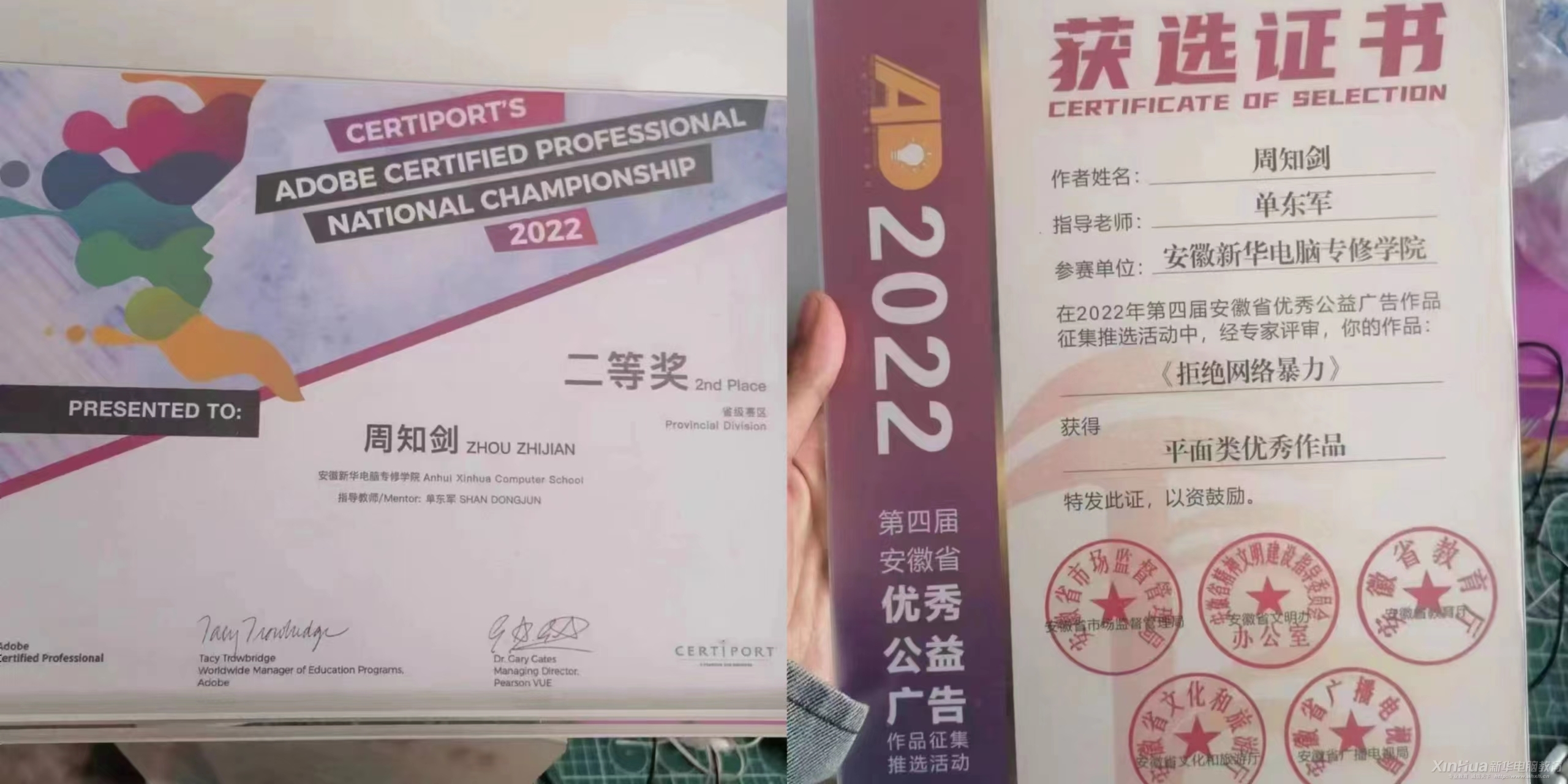 潛心精技,上下求索周知劍認為參加職業技能大賽和項目實踐是精技路上必不可少的一環,他在入學第一年就開始跟團打比賽,雖然是團隊中的小白,但是他收獲頗多,無論是比賽節奏還是競賽心理,在日積月累中達到了全新的高度。一分努力,一分收獲。因專業技能突出,在入學第二年經過校級選拔入選第九屆全省職業技能大賽安徽新華高級技工學校平面設計方向代表隊,經過層層對抗,周知劍脫穎而出,成功斬獲第九屆全省職業技能大賽平面設計技術安徽省金獎(安徽省唯一),隨后周知劍被確定為第二屆全國技能大賽安徽省集訓選手,備戰國賽。