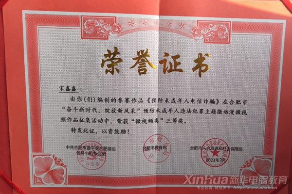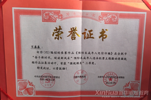 為深入推進合肥市預防未成年違法犯罪專項行動,2023年4月7日,全市“奮斗新征程,綻放新風采”預防未成年人違法犯罪教育宣傳活動在合肥市經貿旅游學校圓滿舉行,安徽新華組織學子線上觀看并參與活動,安徽新華童海苗老師、宋鑫鑫老師分別榮獲《預防未成年人違法犯罪微動漫微視頻大賽》微動漫組三等獎、微視頻組三等獎并現場領獎。