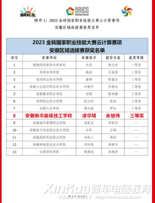 近日,2023年金磚國家職業技能大賽云計算賽項在桐城落下帷幕,安徽新華新華電腦專修學院凌華琦老師榮獲三等獎。