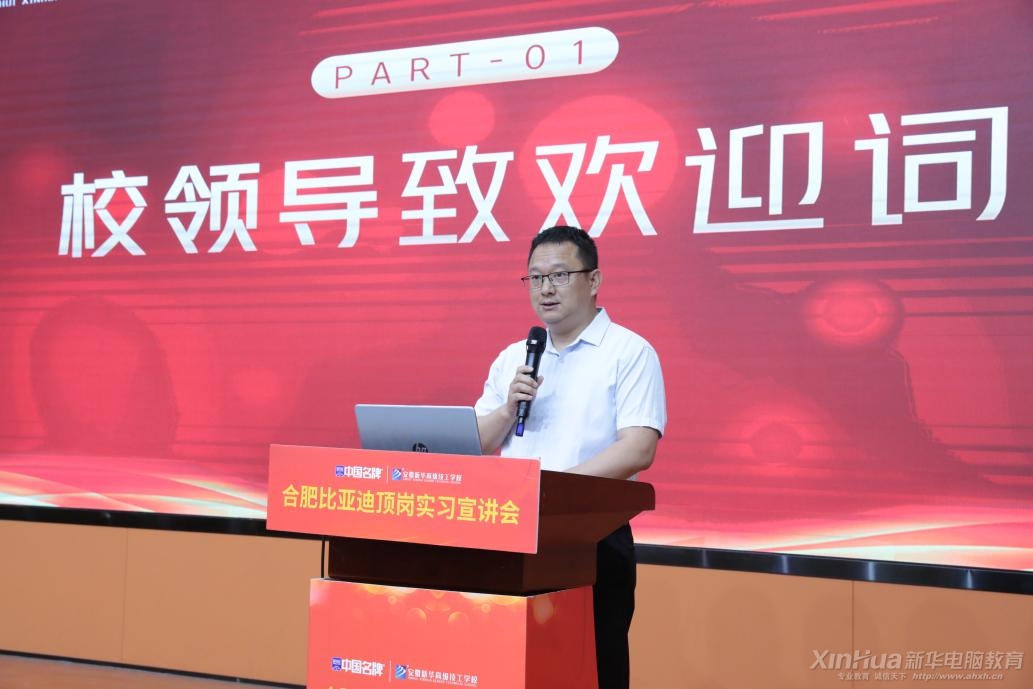 安徽新華高級技工學校校長助理盛文兵出席活動并致辭。校長助理高度贊揚了比亞迪公司的前瞻性和責任感,對比亞迪的宣講表示熱烈歡迎,強調了本次合作對于提升學生實踐技能和就業競爭力的重要意義,同時也表達了對學生們能夠在實習中學習到最新技術、獲得寶貴經驗的熱切期望。
