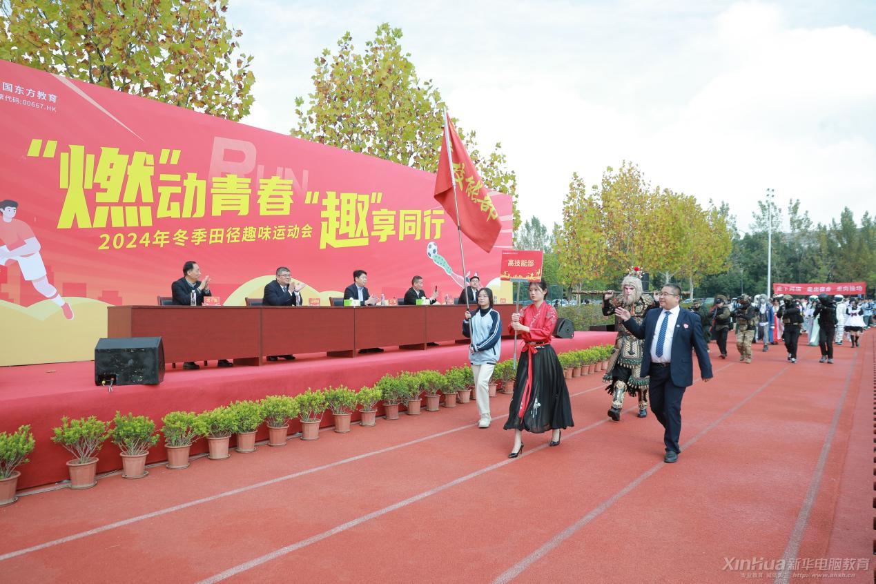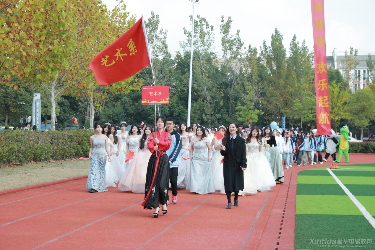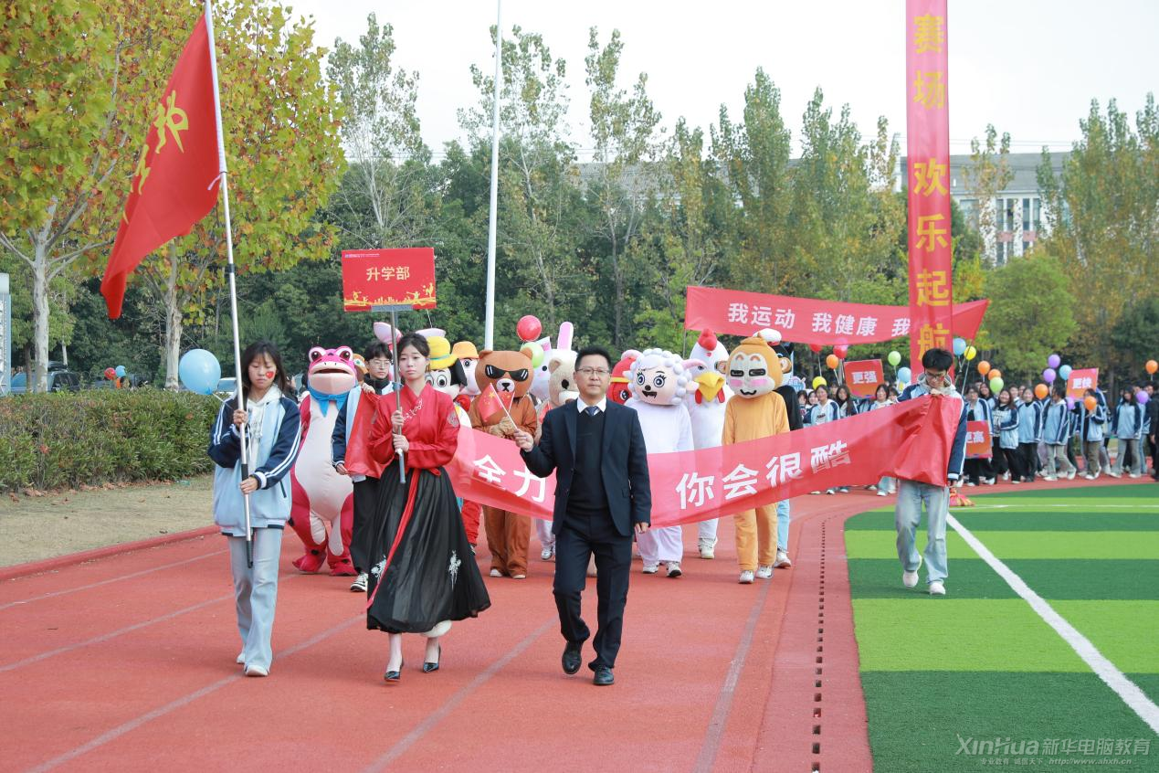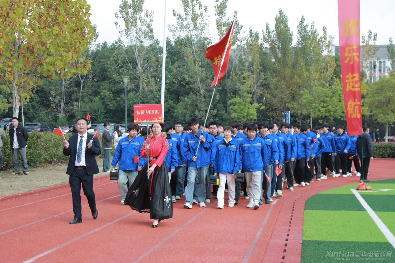 在文藝展示之后,代表隊入場正式開始。首先入場的是旗手方陣,他們手持國旗和校旗,步伐堅定,氣勢恢宏。緊接著是裁判組代表隊,他們身著統一正裝,精神抖擻,彰顯了公平公正的體育精神。隨后,各系部代表隊依次入場,禮儀小姐身著馬面裙,手舉方陣牌,引領著各自系部的運動員隊伍。高技能部代表隊、升學部代表隊、藝術系代表隊、人文教育系代表隊、智能制造系代表隊以及信息工程系代表隊等,每個系部的運動員都身著特色服裝,精神飽滿,步伐矯健,展現了新時代青年的風采。