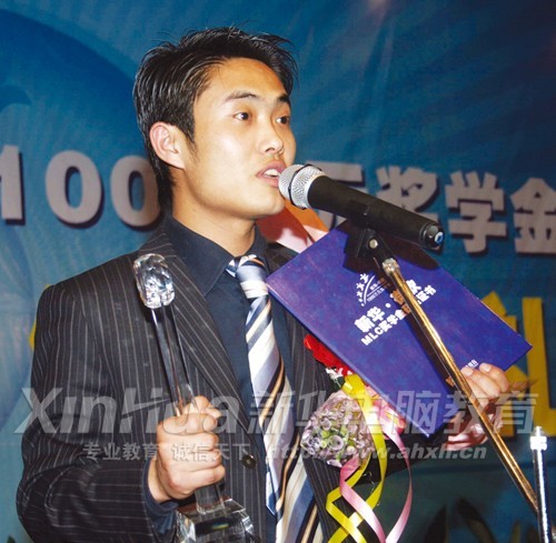 新華電腦教育辦學21年來,50萬學子走向成功,其中絕大部分都是初高中畢業生,趙東亮就是其中的杰出代表。圖為趙東亮在“新華•微軟MLC1000萬元獎學金卓越獎頒獎典禮”上發言感謝母校的培養