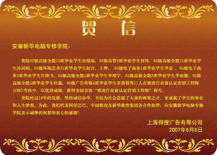 新華電腦專修學院自1988年辦學,19年來已為國家培養了40多萬IT人才,目前,從新華畢業的學子服務于各行各業,在自己的崗位上施展才華、創造輝煌。日前,學院就業指導中心收到了一封來自上海得搜廣告有限公司的喜報,表彰新華學子在公司的發展中做出的突出貢獻并對新華電腦專修學院表示誠摯的祝賀和衷心的感謝。