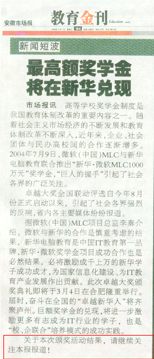 3月1日,《安徽市場報(bào)》“教育金刊”版報(bào)道“最高獎學(xué)金將在新華兌現(xiàn)”的新聞并做了詳細(xì)報(bào)道,敬請關(guān)注!