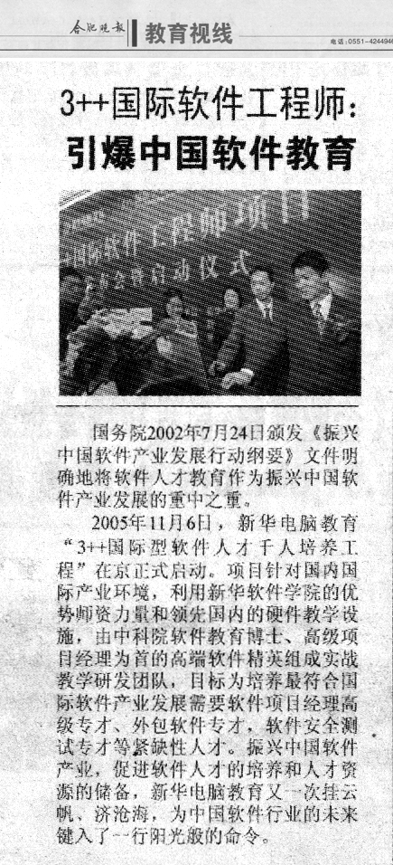 3月6日,《合肥晚報(bào)》教育視線版報(bào)道了“3++國際軟件工程師:引爆中國軟件教育”的新聞,并做了詳細(xì)報(bào)道,敬請關(guān)注!