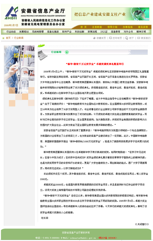 3月6日,省信息產業廳網報道:“‘新華·微軟千萬元獎學金’卓越獎頒獎典禮隆重舉行”卓越獎頒獎的新聞并做了詳細報道,敬請關注!