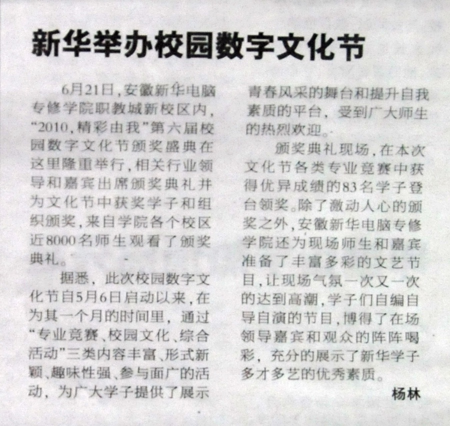 當前位置:首頁 > 新聞中心 > 青春新華 > 《新安晚報》報道:新華舉辦校園數(shù)字文化節(jié)