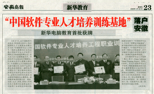 3月30日,《安徽商報》報道:中國軟件專業(yè)人才培養(yǎng)工程職業(yè)訓練基地落戶安徽 新華電腦教育首批獲牌的新聞并做了詳細及相關(guān)報道,敬請關(guān)注!