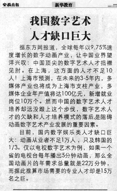 據東方網報道,全球每年以9.75%速度增長的數字動畫產業,讓中國業界望洋興嘆:中國頂尖的數字藝術人才捉襟見肘。在上海,這方面的人才不足10人!上海市預測,在未來的3-5年內,多媒體產業也將成為上海市支柱產業,多媒體企業年產值將達100億元,新增就業崗位10萬個。然而中國的數字藝術人才培養卻遠沒跟上這個步伐,數字娛樂人才的欠缺和人才培養模式的落后,阻礙動畫數字娛樂產業發展的重要因素。