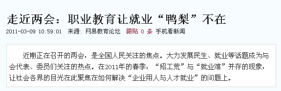 近期正在召開的兩會,是全國人民關注的焦點。大力發(fā)展民生、就業(yè)等話題成為與會代表、委員們關注的熱點。在2011年的春季,“招工荒”與“就業(yè)難”并存的現(xiàn)象,讓社會各界的目光在此聚焦在如何解決“企業(yè)用人與人才就業(yè)”的問題上。