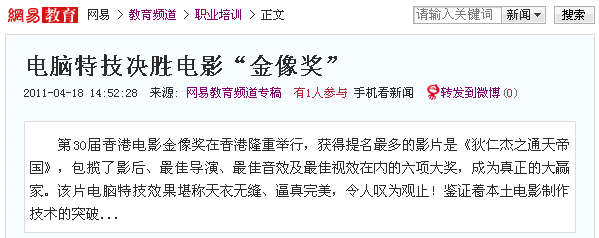 網(wǎng)易教育訊 4月17日晚,第30屆香港電影金像獎在香港隆重舉行。港片《打擂臺》獲得包括最佳影片在內(nèi)的四項(xiàng)大獎;謝霆鋒憑《線人》摘影帝;劉嘉玲憑借在《狄仁杰之通天帝國》中飾演武則天一角,斬獲影后桂冠。而獲得提名最多的影片是《狄仁杰之通天帝國》,包攬了影后、最佳導(dǎo)演、最佳音效及最佳視效在內(nèi)的六項(xiàng)大獎,成為真正的大贏家。