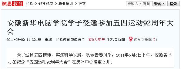 為了弘揚(yáng)五四精神,實(shí)踐科學(xué)發(fā)展,展示青春風(fēng)采,2011年5月4日下午,我省舉辦的紀(jì)念“五四運(yùn)動92周年大會”,在奧體中心隆重召開。省黨政軍領(lǐng)導(dǎo)張寶順、王三運(yùn)、王秀芳、張俊、唐承沛、張學(xué)平、袁斌等出席大會,安徽新華電腦專修學(xué)院的學(xué)子們也一同受邀來到奧體中心,參加了此次紀(jì)念大會。