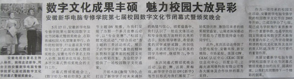 當(dāng)前位置:首頁(yè) > 新聞中心 > 青春新華 > 《安徽商報(bào)》報(bào)道:數(shù)字文化成果豐碩 魅力校園大放異彩