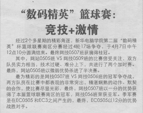 經(jīng)過2個多星期的精彩角逐,新華電腦學(xué)院第二屆“數(shù)碼精英”杯籃球聯(lián)賽南區(qū)分賽經(jīng)過4輪17場爭奪,于4月7日中午12點10分圓滿結(jié)束。最終網(wǎng)技0507班獲摘得桂冠。