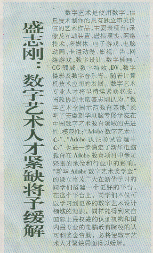 4月29日,《合肥晚報》報道:“盛志剛:數字藝術人才緊缺將予緩解”的新聞,敬請關注!
