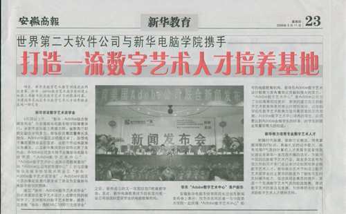 安徽新華電腦專修學(xué)院院長沙旭在新聞發(fā)布會上表示:作為華東地區(qū)惟一與中國美術(shù)學(xué)院一起獲得“Adobe數(shù)字藝術(shù)中心”稱號的電腦教育機(jī)構(gòu),新華在Adobe數(shù)字藝術(shù)設(shè)計教育方面有著突出貢獻(xiàn)和強(qiáng)大的實(shí)力。“Adobe數(shù)字藝術(shù)中心”是Adobe公司為了協(xié)助高等院校更好、更快的建立自己的數(shù)字藝術(shù)教育體系而推出的授權(quán)項目,以協(xié)助學(xué)校在數(shù)字藝術(shù)教育朝向高層面的方向發(fā)展。Adobe數(shù)字藝術(shù)中心培養(yǎng)的學(xué)生,必須要達(dá)到Adobe合格學(xué)生的標(biāo)準(zhǔn),對學(xué)生的就業(yè)有著非常大的助益。