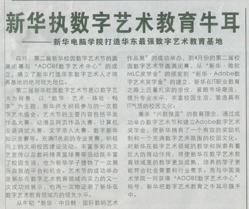 秉承“興教報國”的教育理念,通過成功舉辦數字藝術節和建立Adobe數字藝術獎學金,使新華擁有了一個有效的獎勵機制和一個充滿數字藝術氛圍的校園文化。對新華在數字藝術領域的教學和探索有著巨大的推動作用,將使新華在數字藝術教育領域里的教學更加成熟,培養的學子更能符合社會需要和行業需求。而與中國美術學院一同獲得“Adobe數字藝術中心”稱號,新華把數字藝術教育之牛耳盡握手中。