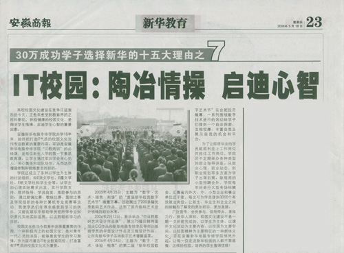 5月18日,《安徽商報》報道:“IT校園 陶冶情操 啟迪心智”的新聞,敬請關(guān)注!
