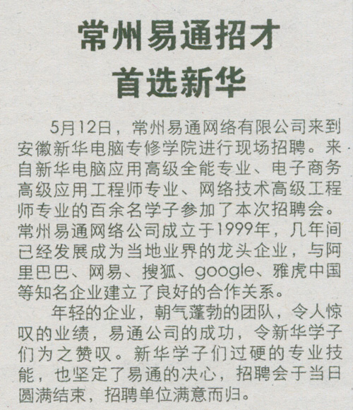 5月12日,常州易通網(wǎng)絡(luò)有限公司來到安徽新華電腦專修學(xué)院進行現(xiàn)場招聘。來自新華—電腦應(yīng)用高級全能專業(yè)、電子商務(wù)高級應(yīng)用工程師專業(yè)、網(wǎng)絡(luò)技術(shù)高級工程師專業(yè)的百余名學(xué)子參加了本次招聘會。常州易通網(wǎng)絡(luò)公司成立于1999年,幾年間已經(jīng)發(fā)展成為當(dāng)?shù)貥I(yè)界的龍頭企業(yè),與阿里巴巴、網(wǎng)易、搜狐、google、雅虎中國等知名企業(yè)建立了良好的合作關(guān)系。