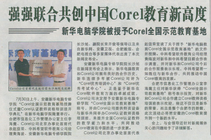 合肥市信息化工作管理辦公室李海鷹主任對新華獲得“Corel全國示范教育基地”稱號表示祝賀,對新華和Corel公司合作建立Corel教師資格培訓班表示歡迎,稱這不僅僅是新華的榮譽,而且是整個合肥市的驕傲,此次活動必將把安徽的Corel教育提升到一個新的水平。